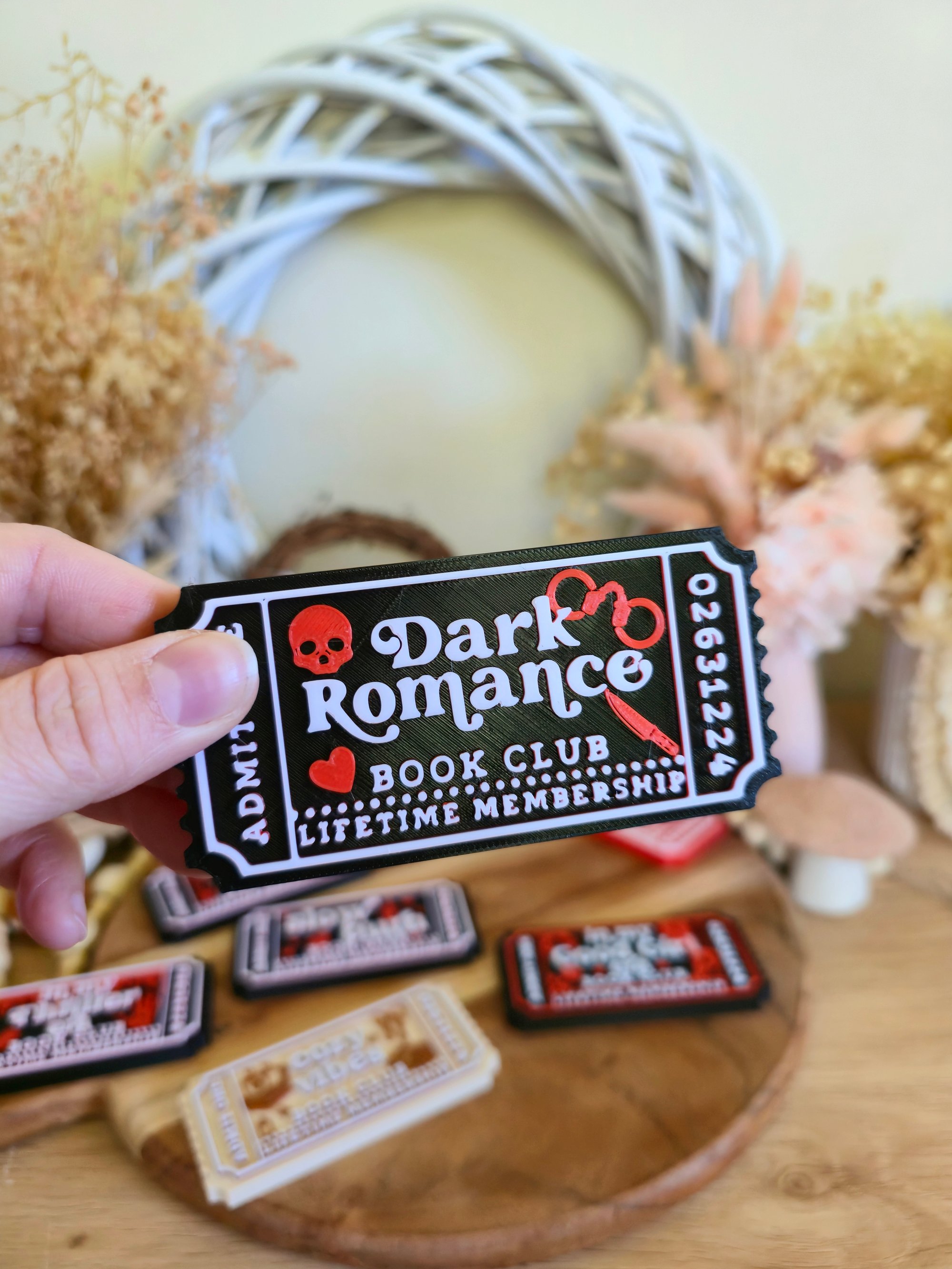 Add a bold, moody touch to your bookshelf with this Dark Romance Book Club ticket-style decor. Designed like a vintage admission ticket, this piece is perfect for readers who love intense romances, morally grey characters, and stories that blur the line between danger and desire.