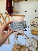 Approximately 10cm wide and just under 5cm tall. Ticket also stands up on its own.